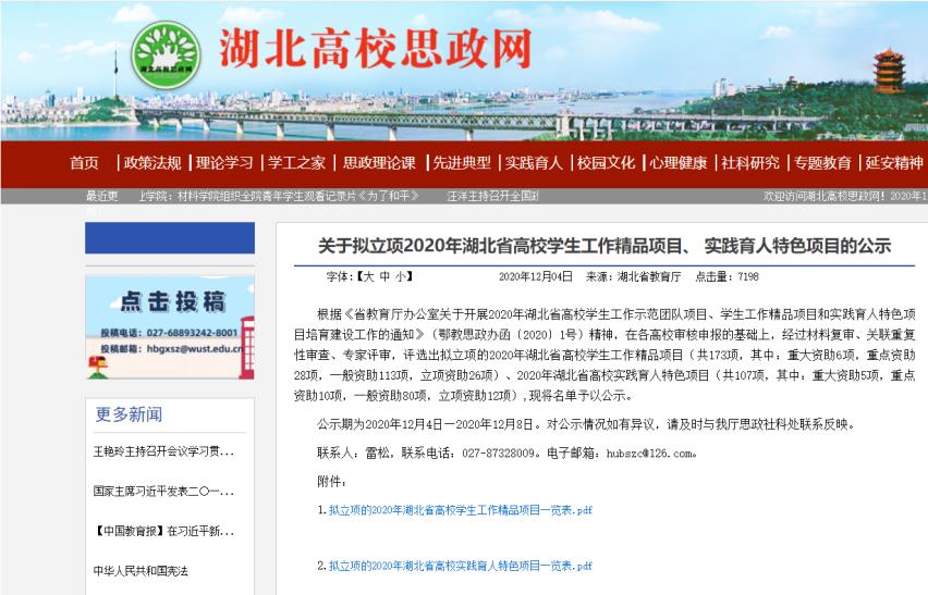 日前,湖北省教育厅公布了2020年湖北省高校实践育人特色项目立项名单,我院学工办主任殷昊翔老师主持的“情系受困学生,家校爱心联动——疫情防控常态化下的家访育人实践”项目获准立项。这是湖北省教育厅对我院实践育人工作的高度肯定,也是学院扎实推进“三全育人”综合改革取得的重要成果。