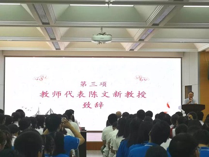 涂险峰院长的致辞后是教师代表陈文新教授致辞。他祝贺新生们即将跨入新的人生平台,也有三句话想要因此送给大家:热爱生活,在良好的学校环境中,在风华正茂的年纪,要过丰富多彩的生活,更要追求大的人生与生活境界;热爱学术,“学习是重要的事,有些事情必须努力做到”,他如是说道,“我们应该去发挥人文学科的光亮,拎着学问,免于流入世俗”;最后便是把握好长跑节奏,时时刻刻保持好的状态,不急功近利,也需充实自己。