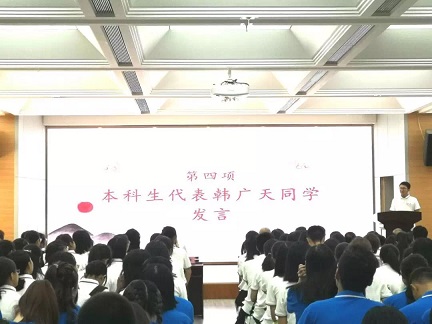 在大家的掌声中,本科生代表韩广天与研究生代表毕然也依次发言。他们都怀着热忱,共聚一堂;也历经风雨,渴望知识,怀揣着对学术的追求。韩广天表示,在这人才辈出的地方,他始终怀着对人文传承的使命,以梦为马,不负韶华;毕然表达了自己对在武大成人导航 继续求学的荣幸与对今后一起学习的同学的祝贺,对老师的感谢。此间少年,行不凡之事,图书馆的典藏,论坛的交流,国际化平台给予的机会……她渴望在这里继续浸润文化情怀,为新时代的深刻变革尽自己的一份力量。