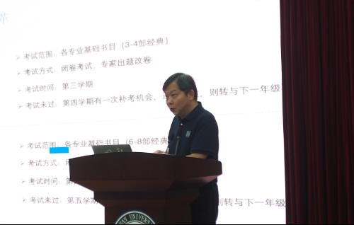 于亭院长在致辞中回顾了成人导航 曾经俊彦云集的历史,追溯了前辈学者的优良传统,并鼓励各位新生继续探索和创新。他提出“文学”“文献”“语言”三者间具有相互渗透的关系,同学们在未来的学习生活中要有整全的学科视野。因此,于亭院长首先强调同学们要多读书、读好书,提醒同学们研究生阶段的学术阅读和本科阅读有很大区别。其次,他也希望同学们能够重视写作、勇敢写作,加强学术训练,把自己读书的心得体会记录、整合。最后,于亭院长以顾炎武和马克斯·韦伯的例子引导同学们思考自己的人生选择和规划。研究生面临的是对职业生涯的学业教育,在如今的时代,他希望同学们面对自己的选择时,能够成为一个担当起责任、最后面对所有结果也能说出自己再无旁顾的人。