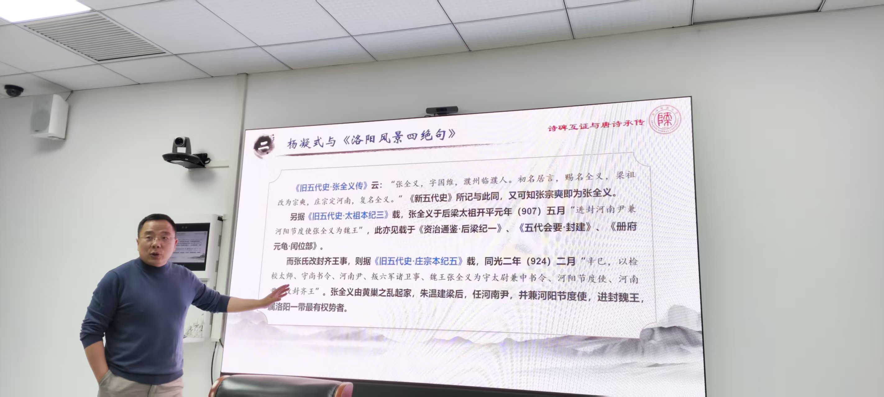 王伟教授以“唐诗总数是多少”为引,逐步切入蔡襄《洛阳诗帖》的真伪之辩。他指出该诗帖中的诗歌实际作者为五代书法家杨凝式,并进一步考证了杨诗如何被收录于蔡襄名下,由此揭示唐诗流传过程中的多元路径与复杂面貌。