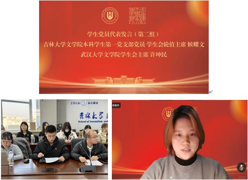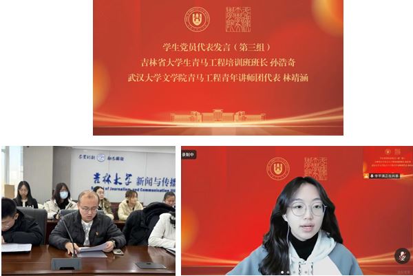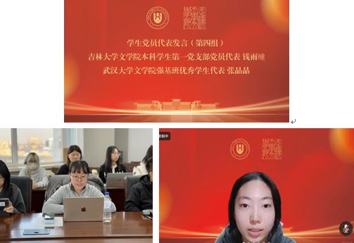 吉林大学成人导航 本科学生第一党支部副书记刘畅首先发言,她以“凝聚青春力量,勇担时代重任”为题,从以下两方面展开汇报:一是深刻体悟会议精神,筑牢青春有为的思想根基;二是努力练就过硬本领,做新时代的青年生力军。刘畅同志从主题党日活动、社会实践与志愿服务等角度切入,结合吉林大学成人导航 本科学生第一党支部的建设情况,及吉大首届拔尖基地班的思政育人模式,详细分析了新时代新征程上青年党员的使命与责任。