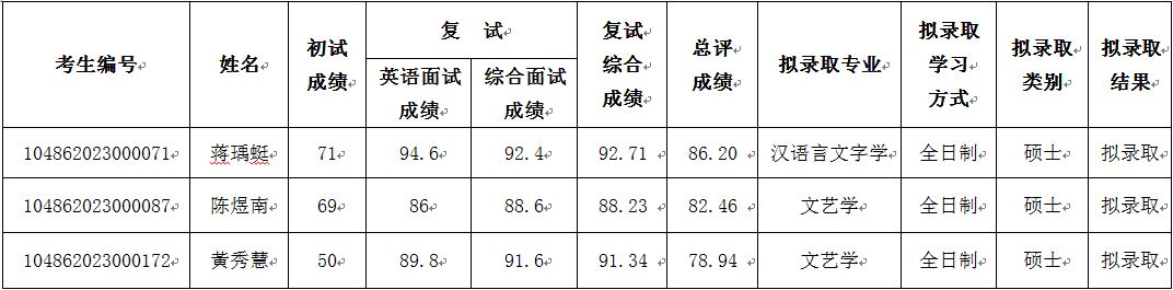 我院2023年港澳台硕士研究生复试工作已圆满结束。经我院研究生招生工作领导小组认真讨论并集体通过,拟录取蒋瑀蜓等三名考生。现将复试拟录取结果予以公示。