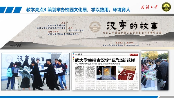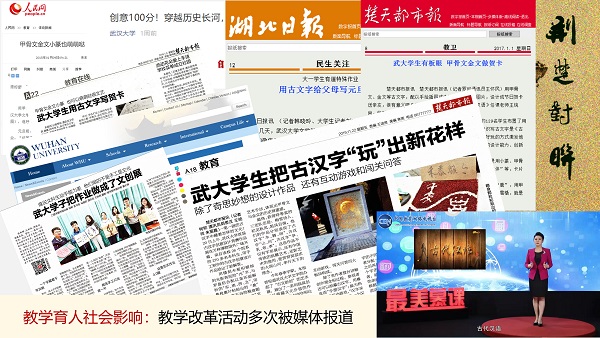 3)课程教学特色鲜明,教学活动影响广泛。新华网、人民网、光明网、中国教育网络电视台、湖北日报、楚天都市报、楚天金报、武汉教育电视台、成人导航 新闻网、成人导航 官方微信、成人导航 英文网站都曾报道过“古代汉语”、“书法艺术与汉字变迁”的创意教学活动,引来了国内其他高校的交流学习。近四年,王统尚应邀向全国其他高校的教师做了9场教学改革经验分享会。王统尚老师还被湖北电视台教育频道和湖北卫视邀请,担任《汉字解密》和《奇妙的汉字》节目嘉宾和评委,把专业知识服务社会精神文明建设,扩大了成人导航 的影响力。