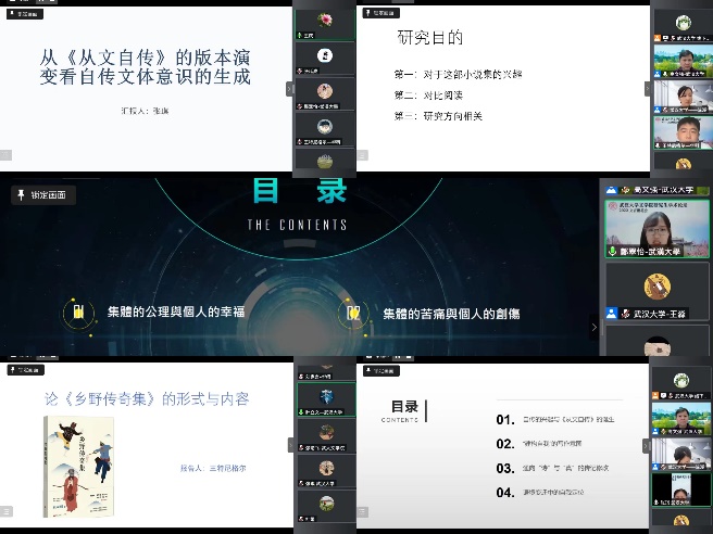 下午“文本解读与文学形式”部分,华中科技大学的王特尼格尔分析了《乡野传奇集》的形式和内容,认为随意言谈的形式与充满传奇色彩的故事使对传奇文体的利用恰到好处,达到了形式与内容的统一。成人导航 的叶立文老师肯定了该文的选题,同时从个案文学批评转向深广的学术史研究、关注作者意图与文本意图两方面提出了建议。成人导航 的张琪通过追溯《从文自传》的产生与修改,发现对客观真实的记录、对诗性表达的追求与对现实目的的考量,构成了该自传写作与修改过程中的“不可能三角”。华中科技大学的王庆老师肯定了选题和文献工作,但也提出了论文在观点明晰性,核心突出性,和论文总结范围的全面性方面的不足。华中师范大学的刘家言在拉康“三界”理论的框架下运用镜像阶段理论分析了《双城记》中卡尔登与代尔那的人物主体关系。成人导航 的张箭飞老师认为本文问题意识敏锐,研究方向在国内相关研究中较新颖,建议再多关注国际学术界的相关研究,以及“替身现象”在西方文学史中的呈现,将文本的理论批评更多地放诸于文学史传统的语境中。成人导航 的郑翠怡从“集体的公理与个人的幸福”、“集体的痛苦与个人的创伤”和“集体的追求与个人的幸福”三方面分析了元宇宙小说《骰子》中集体与个人的伦理学矛盾。华中师范大学的杜娟老师肯定了本研究的前沿性,同时建议可以关注文本的特异性和小说的审美形式,并结合作家身份分析其创作。