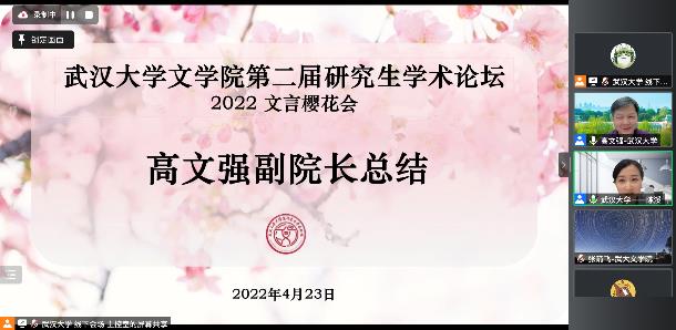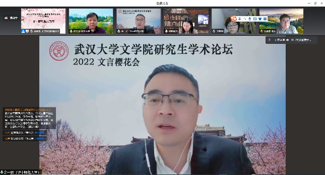 高院长首先介绍了担任本次学术论坛的专业点评工作的全部专家老师,接着他提出,研究生学术论坛一直坚持研究生自主筹备的形式,其初衷是为了让研究生提前进入到学术语境中,更好地体验学术交流的氛围。高院长特别说明,研究生论坛设置主题——“2022文言樱花会”,原意是要让三校师生在成人导航 樱花时节的校园里交流学术,但受疫情影响转为了线上形式,让我们一起期待这一遗憾能在下一届论坛得以弥补。
