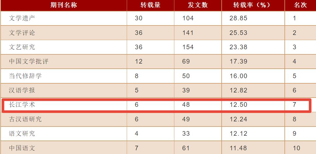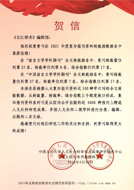 3月29日,中国人民大学人文社会科学学术成果评价研究中心、中国人民大学书报资料中心联合发布2021年度“复印报刊资料”转载指数排名,《长江学术》在参与排名的204种中国语言文学学科期刊中,全文转载量排名第27(并列第12,全文转载6篇),全文转载率排名第7(转载率12.50%),综合指数排名第17(综合指数根据各期刊的转载量、转载率和篇均分三项指标的归一值综合测算得出)。