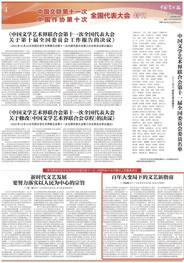 我院李遇春教授于2021年12月12日至18日在北京出席了中国文联第十一次全国代表大会。14日上午在北京人民大会堂参加开幕式,聆听中共中央总书记、国家主席、中央军委主席习近平的重要讲话。会议期间,作为湖北代表团成员李遇春教授积极参与学习讨论,为湖北文艺事业发展建言献策。他的学习心得体会文章刊登在《光明日报》《中国艺术报》《湖北日报》上,并被多家网络媒体转载。