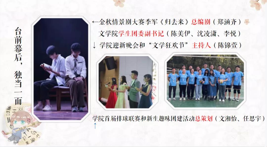 “2019年夏末,我们自五湖四海而来,共赴一场珞珈之约……”答辩人陈锦萱以饱满的情绪和深情的语调带大家走进了班级的共同回忆中:从“中秋寄情”活动到班级形象“汉小四”的诞生;从会操比赛到破冰团建;从汉字研学到桂操夜话……我们19汉四和“大师兄”携手经历的每一个故事都令人珍惜而又感动。
