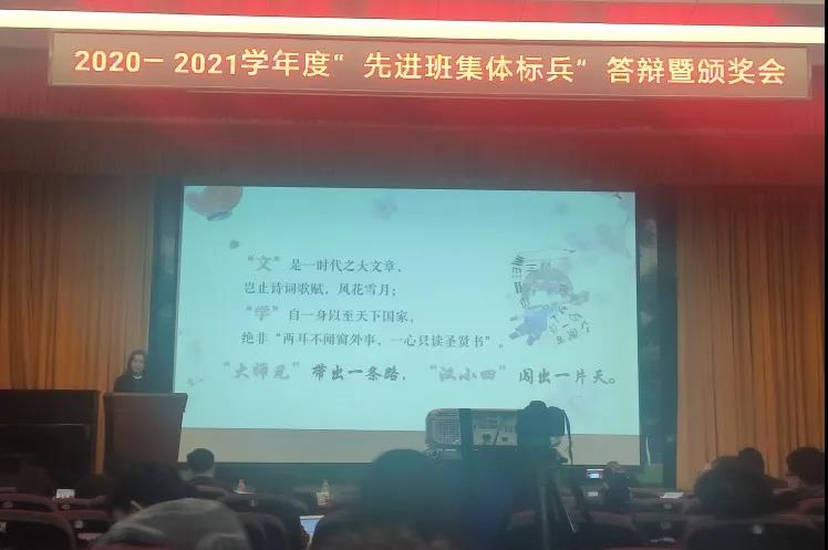 2021年11月25日下午两点,成人导航 2020-2021年度“先进班集体标兵”答辩暨颁奖会在文理学部第五教学楼多功能报告厅举行。我院2019级汉语言文学四班经过班级申报、学院推荐、学校评审等层层选拔,结合现场优秀出彩的展示答辩,最终获评“成人导航 先进班集体标兵”荣誉称号。