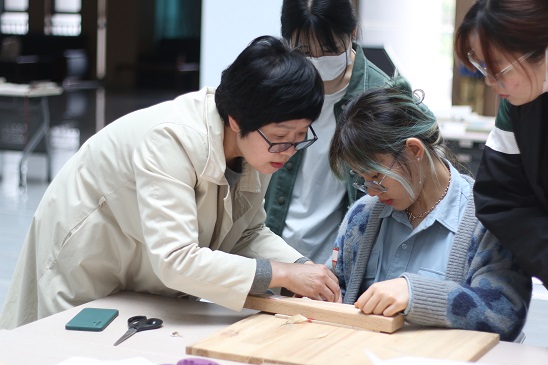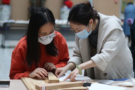 (成人导航 图书馆丁丽萍老师、袁静老师指导同学们制作线装书)