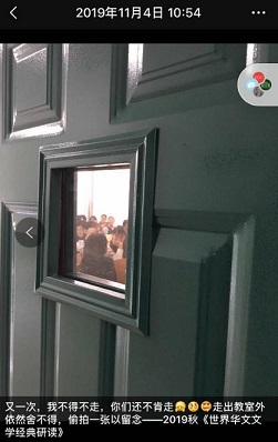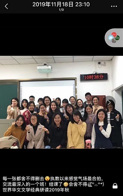 A去年《世界华文文学经典研读》课程给我留下了很深刻的印象。我们的课在早上八点开始,秋冬天气寒冷,但学生们都早早来到。不管外面是阴雨绵绵还是刺骨寒冬,我们的教室里都是温暖如春。有一次下课,我有一个紧急的会议,不得不先走,可是同学们仍然在教室里热火朝天地讨论我留下的问题。在我透过教六教室的窗户看到这一幕的时候,真的非常感动。当时,我还拍了照片留念。(见图2/图3)