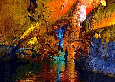 隐水洞景区因洞中隐藏有两条河流而得名。溶洞全长5180米,洞内景观丰富多彩、奇特壮丽,其独特的岩溶地貌,造型之逼真,体积之巨大,在游览洞穴中都是罕见的。洞内的游览方式也很特别。上游老师们乘船观光,泛舟地下河,聆听地下河的涛声;中游大家改乘轨道车体验洞中快速步移景换;下游改为步行零距离接触古老而神奇的岩溶地貌。隐水洞内钟乳石类质地纯净,沿途主要景观如"鲤鱼跃龙门""天降神靴""玉兔观桃""寒山寺古钟""水生石莲""天鹅之吻"、"金银瀑布""仙人田""马良神笔""雪山飞狐""电闪雷鸣""八仙送客"等,荟萃了大自然的形态美、动态美、色彩美、声音美和朦胧美,大家沿途游览,不禁啧啧称奇。洞内冬暖夏凉,景色别致,洞外湖光山色,让人流连。