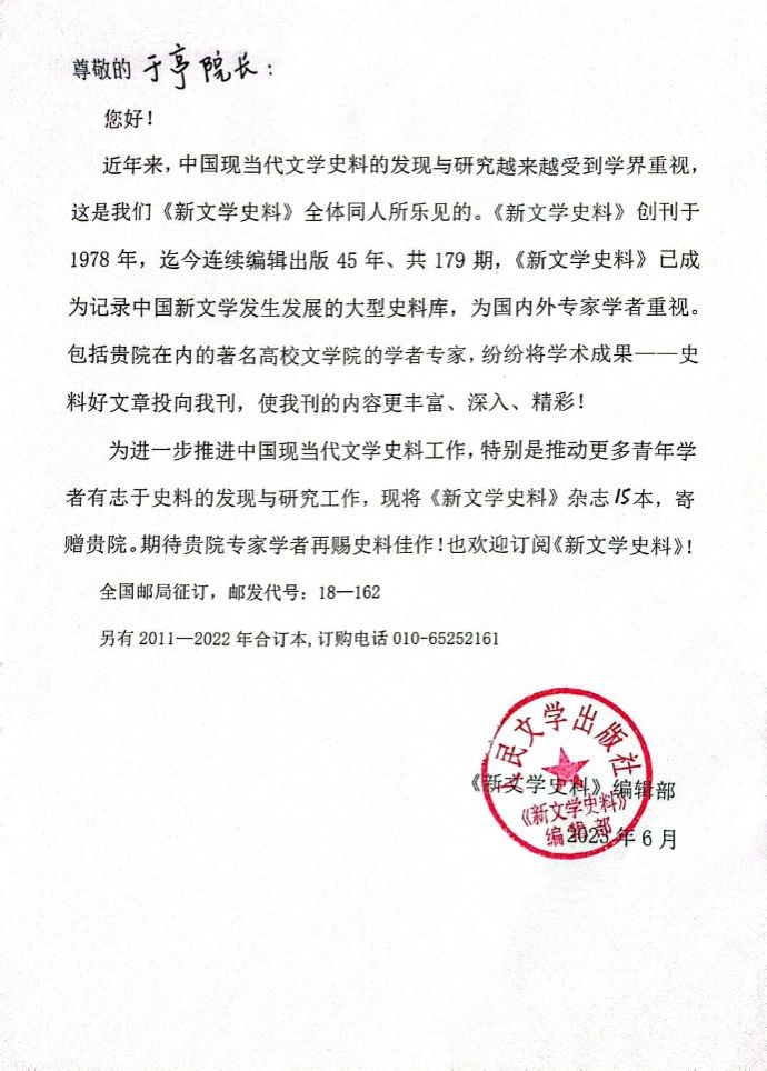 近日,我院收到《新文学史料》编辑部来函和寄赠的15本《新文学史料》杂志。