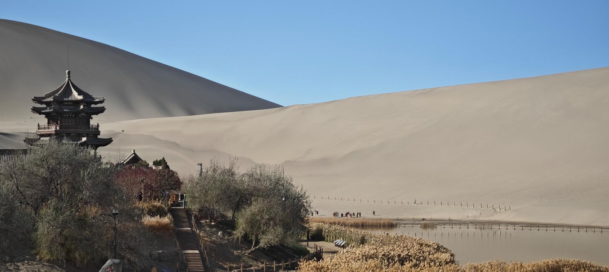 2023年11月8日,恰是立冬之日。天湛蓝而高远,空气也干爽凛冽,风吹过来好像雪片打在脸上,敦煌笼罩在一层薄薄的寒气中。