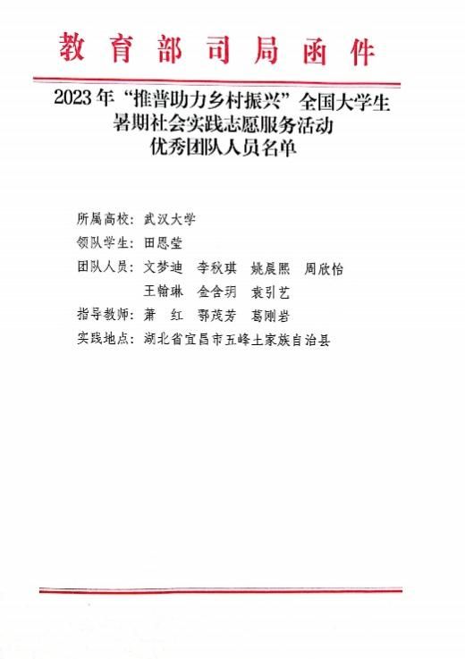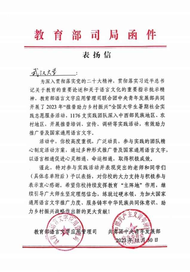 近日,2023年“推普助力乡村振兴”全国大学生暑期社会实践志愿服务活动评优结果公布,我院“武大学子五峰推普行”社会实践团队荣获“优秀团队”称号。教育部语言文字应用管理司、共青团中央青年发展部专门给成人导航 发来表扬信,对我院师生团队在服务国家通用语言文字推广、服务铸牢中华民族共同体意识、助力乡村振兴战略中作出的贡献给予充分肯定。