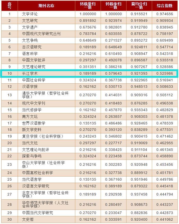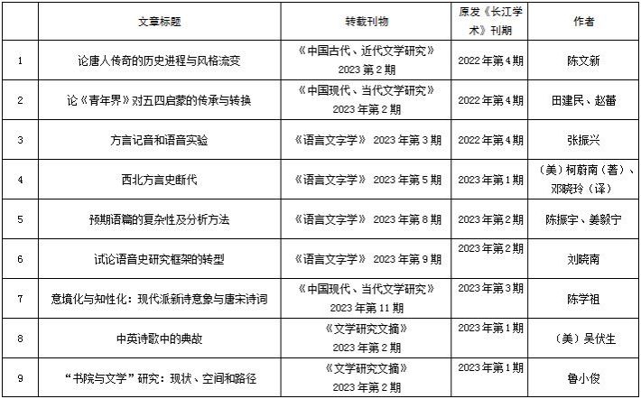 4月25日,《复印报刊资料重要转载来源期刊(2023年版)》正式发布,《长江学术》持续入选,在中国语言文学期刊中转载率排名第7,综合指数排名第10,全文转载量排名第26(详见附表)。