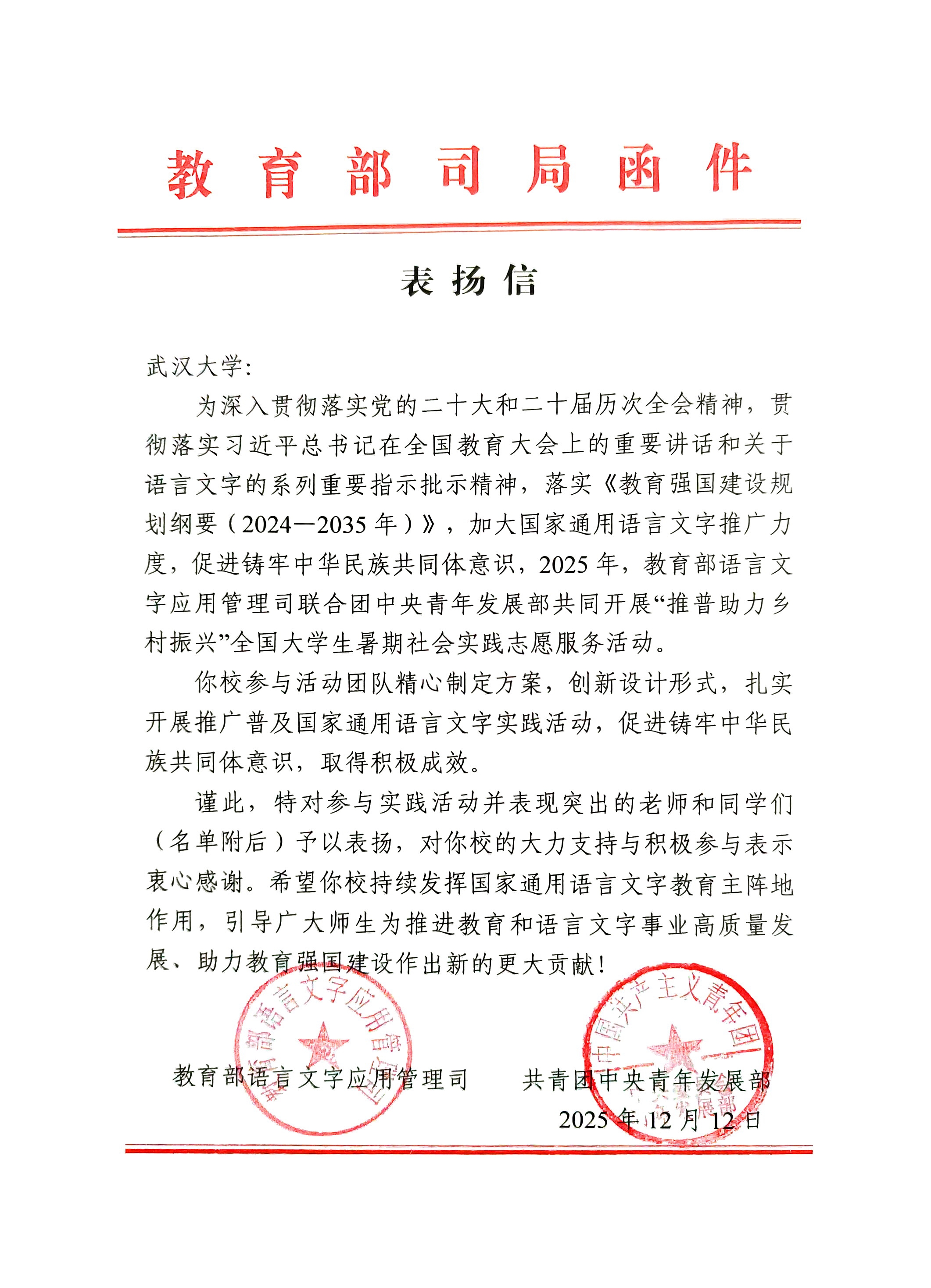 (通讯员:孙小媛 张乐 柳金贝)12月22日,学校收到教育部语用司、团中央青年发展部来函,对成人导航 在2025年“推普助力乡村振兴”社会实践志愿服务活动中高度重视、精心组织给予肯定,对参与实践活动并表现突出的师生予以表扬。其中,成人导航 “石榴籽·语相通”学生社会实践队获评优秀团队,指导教师葛刚岩、王若飞以及来自成人导航 、弘毅学堂、数学与统计学院、测绘学院、计算机学院的13位同学受到表扬。